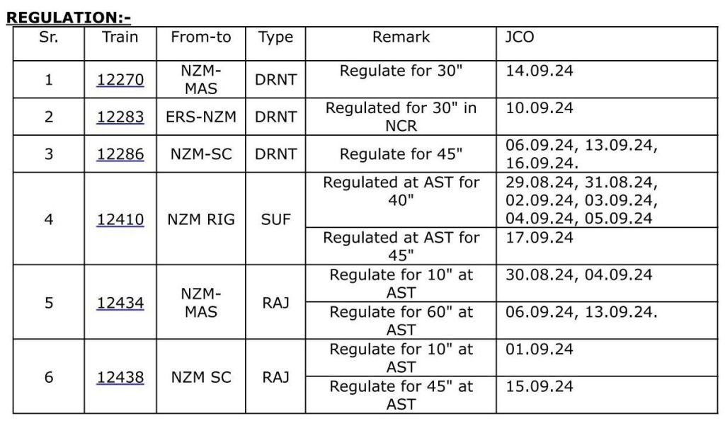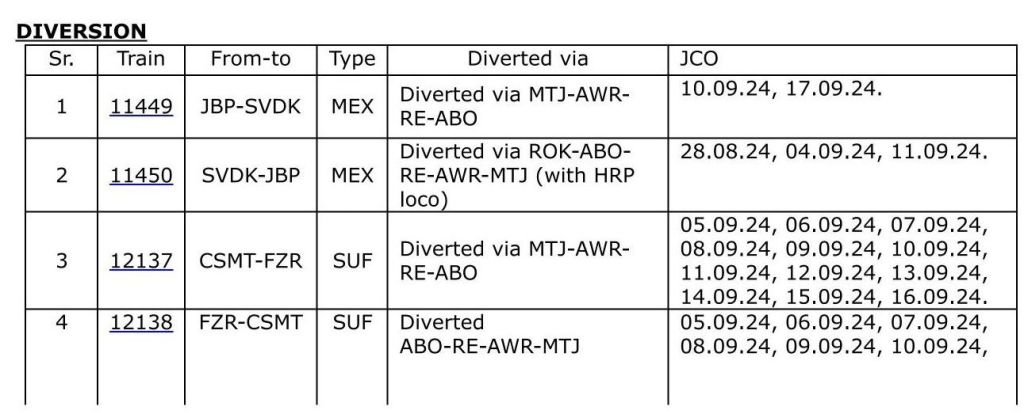निम्नलिखित गाड़ियोंको अपने निर्धारित समय से अलग, देरी से चलाया जाएगा