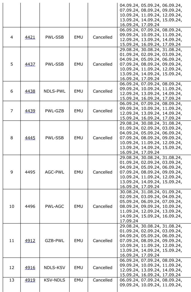 04438 नई दिल्ली पलवल दि. 06/9 से 17/9 तक रद्द