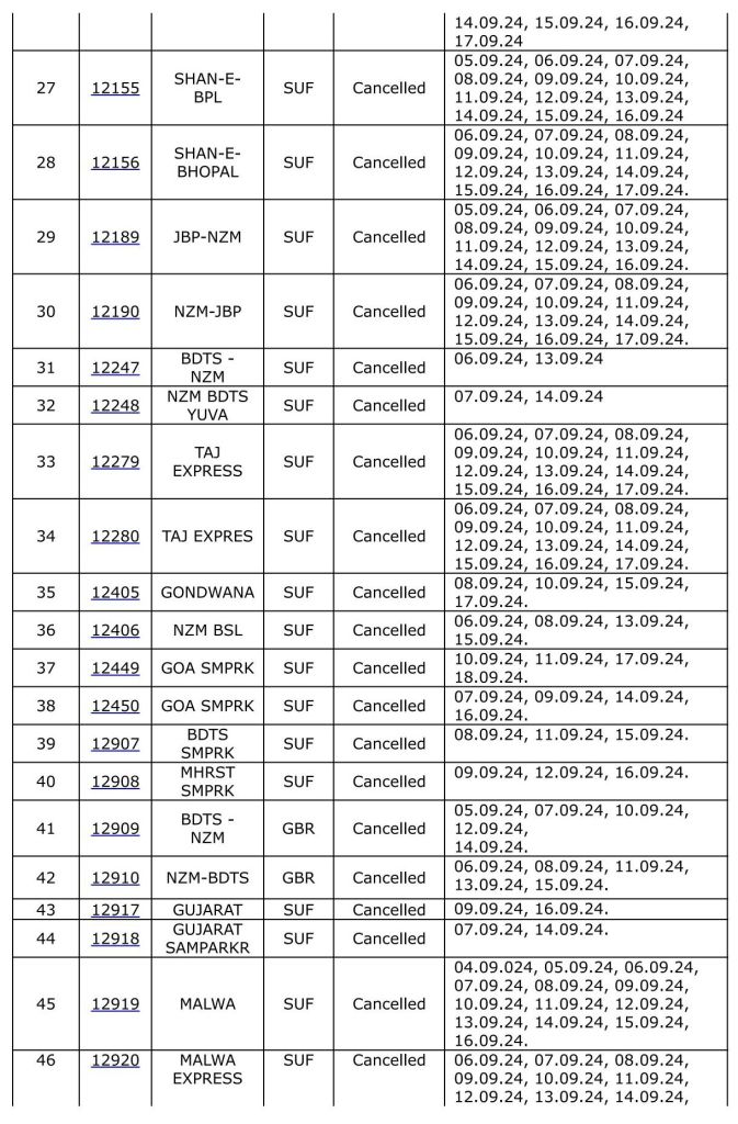 12247 बान्द्रा निजामुद्दीन युवा साप्ताहिक दि. 06 एवं 13 सितम्बर को और 12248 निजामुद्दीन बान्द्रा युवा साप्ताहिक एक्सप्रेस दि. 07 एवं 14 सितम्बर को रद्द रहेगी।