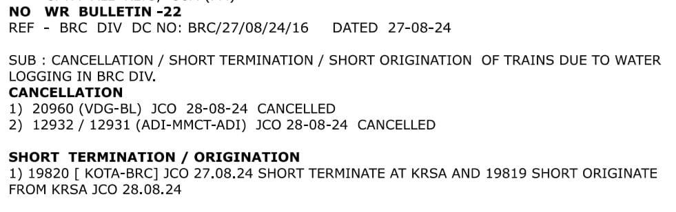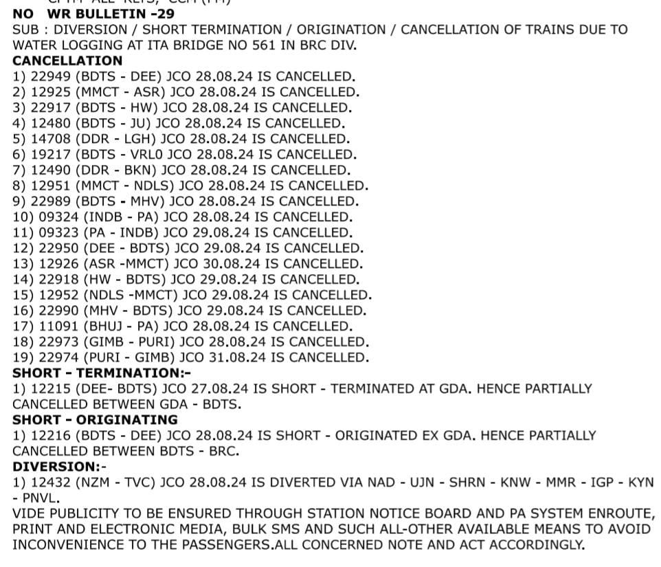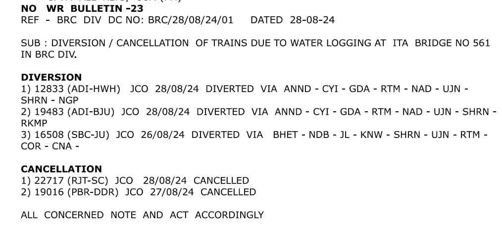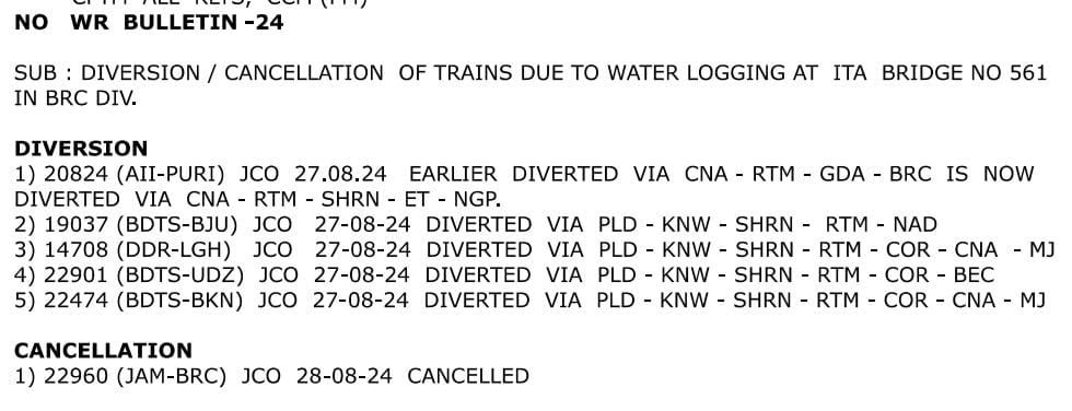 यात्रीगण कृपया ध्यान दीजिए, इस बाधित मार्ग से गुजरने वाली बहुतांश गाड़ियोंके परिचालन में लगातार बदलाव किया जा रहा है। ताजा जानकारी के लिए, कृपया रेल हेल्पलाइन 139 से सम्पर्क बनाए रखे। हमसे जो सम्भव है, वह बुलेटीन्स हम यहाँ देने का प्रयत्न कर रहे है।