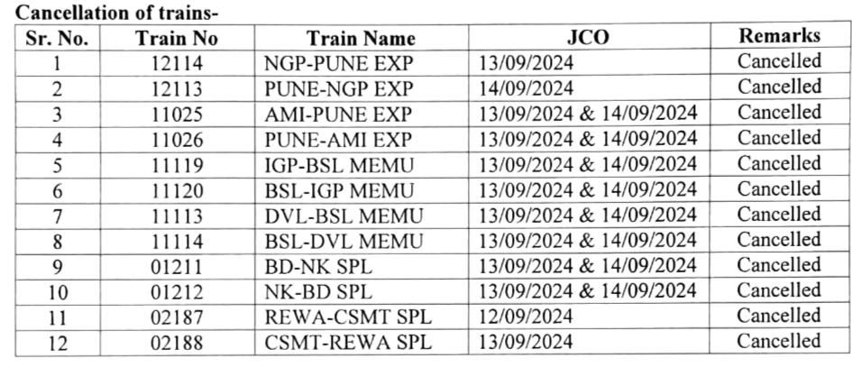 1) 12114 नागपुर – पुणे एक्सप्रेस, यात्रा शुरुवात दिनांक 13.09.2024 को रद्द।