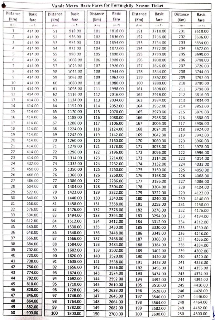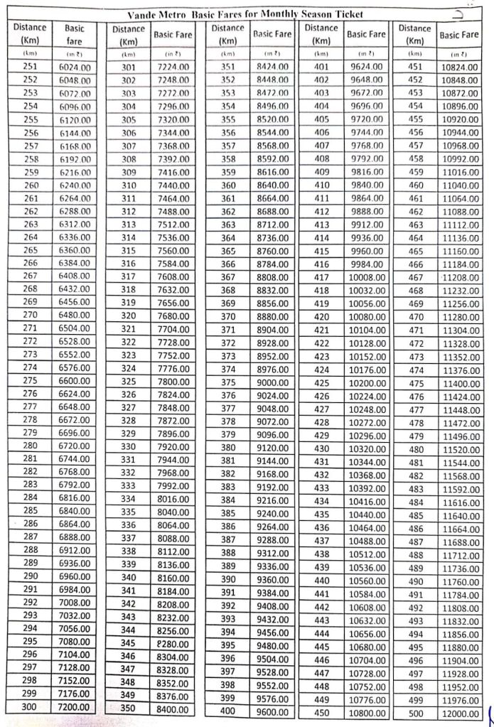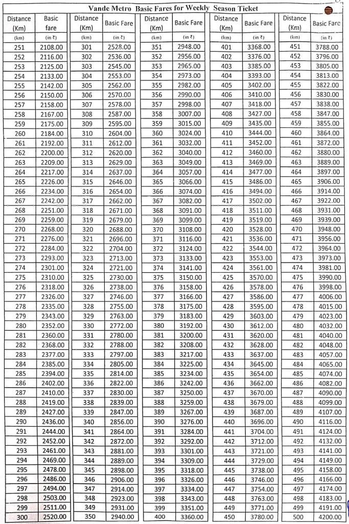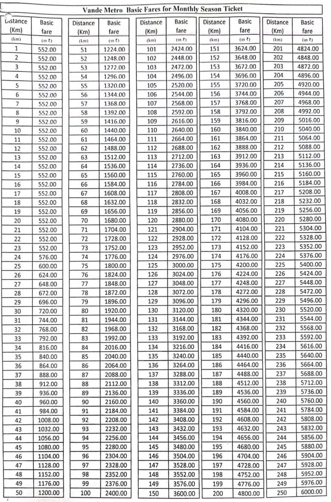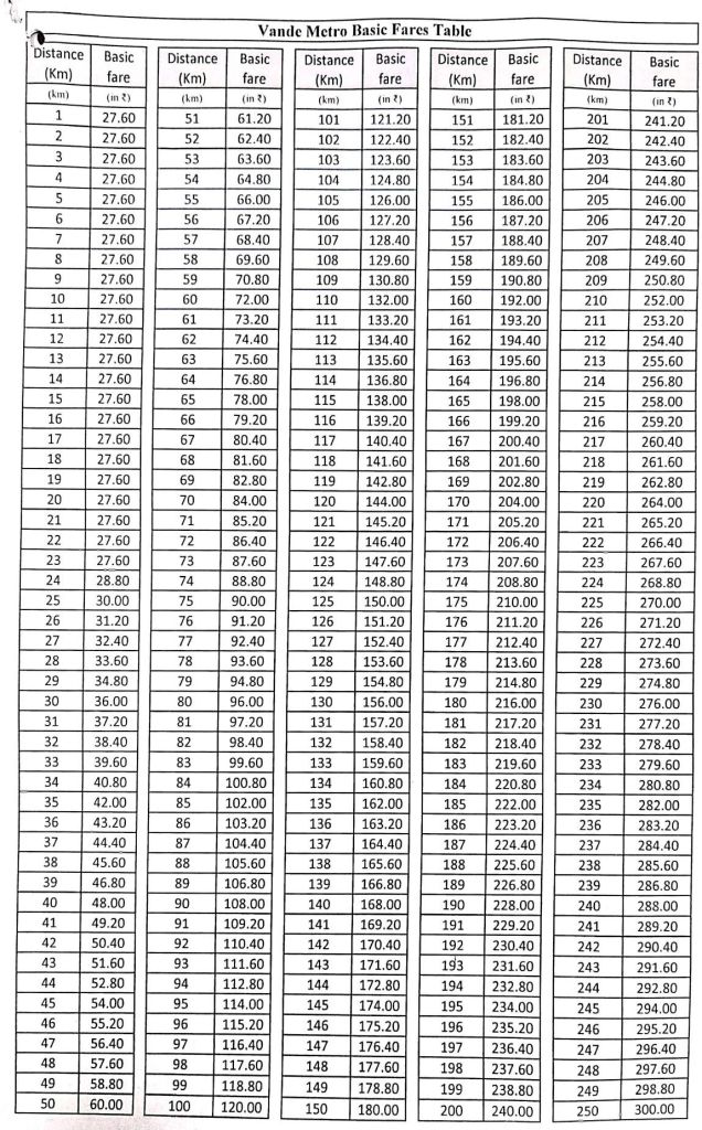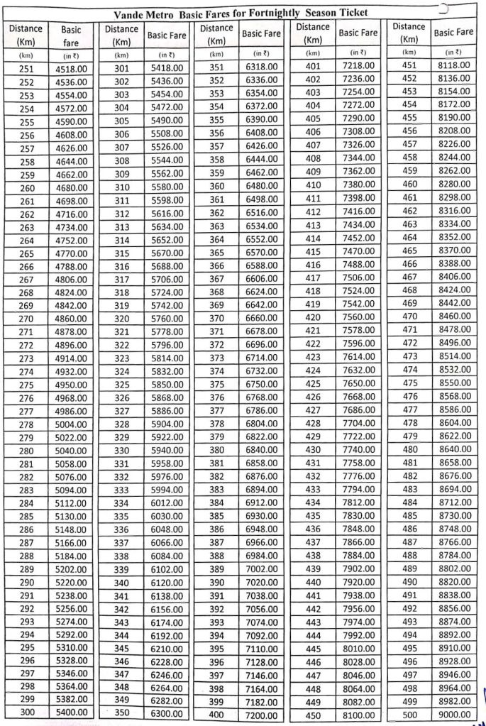 वन्दे मेट्रो की किराया तालिका