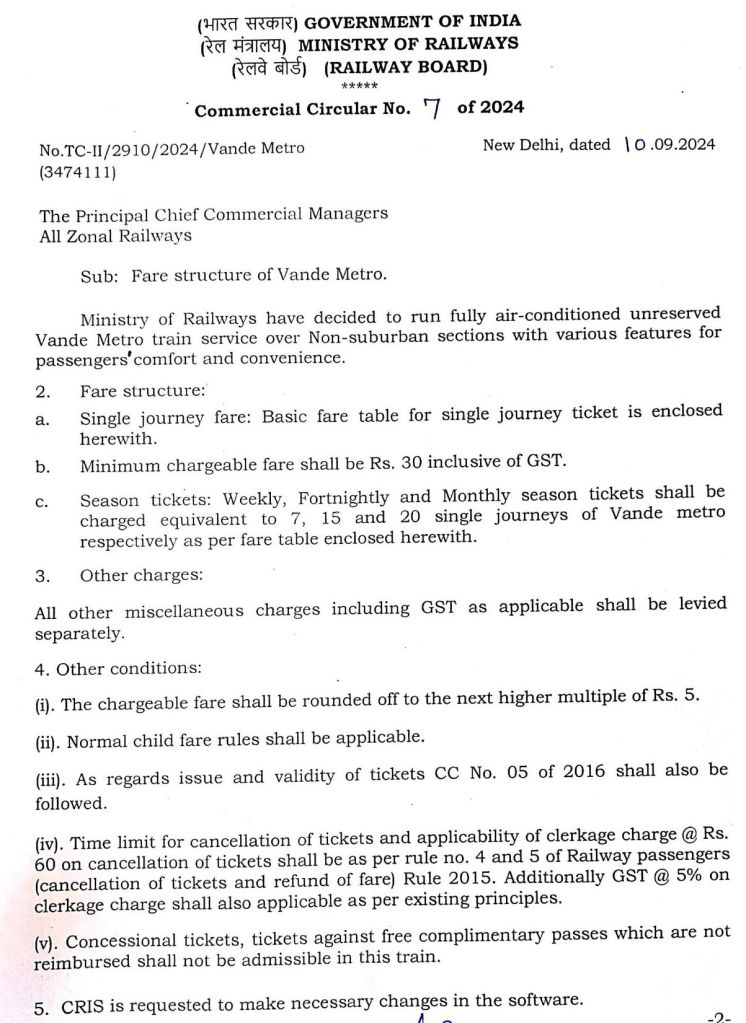 वन्दे मेट्रो के लिए न्यूनतम किराए ₹30/- GST सहित रहेंगे।