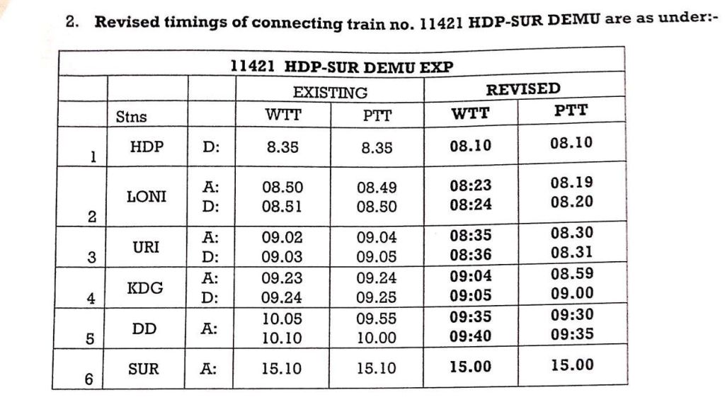 गौर तलब यह है, वापसी में 11421 हड़पसर सोलापुर डेमू एक्सप्रेस जो 01522 डेमू से रैक लिंक थी उसे हड़पसर – सोलापुर के बीच ही जारी रखा जा रहा है। केवल फर्क यह हुवा है, इसकी समयसारणी में दिनांक 05 अक्टूबर से बदलाव किया जा रहा है, जो निम्नलिखित है,