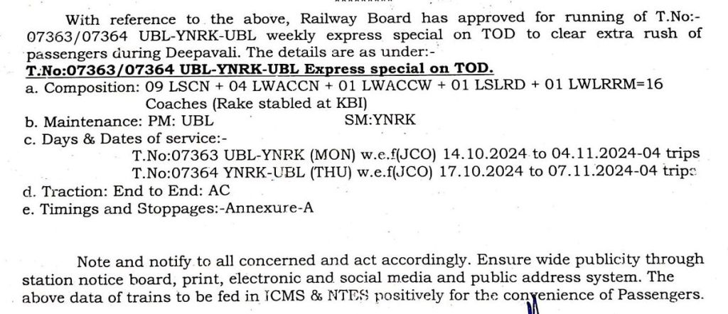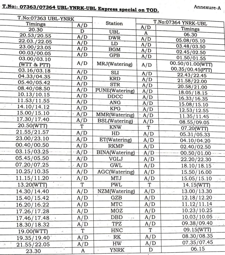 07363 विशेष गाड़ी सोमवार दिनांक 14, 21, 28 अक्टूबर एवं 04 नवम्बर को हुब्बाली से रात 20:30 को चलकर बुधवार को, योगनगरी हृषिकेश रात 23:30 को पहुंचेंगी। वापसी में 07364 विशेष गाड़ी गुरुवार दिनांक 17, 24, 31 अक्टूबर एवं 07 नवम्बर को योगनगरी हृषिकेश से प्रातः 06:15 को चलकर शनिवार को हुब्बाली को प्रातः 06:30 को पहुंचाएगी।