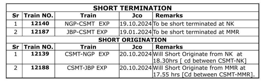 12140 नागपुर छत्रपति शिवाजी महाराज टर्मिनस सेवाग्राम एक्सप्रेस JCO दिनांक 19 अक्टूबर को नागपुर से चलकर दिनांक 20 अक्टूबर को नासिक रोड़ पर समाप्त की जाएगी। गाड़ी दोनों दिशाओंसे, नासिक से मुम्बई के बीच रद्द रहेगी। वापसी में 12139 मुम्बई नागपुर सेवाग्राम एक्सप्रेस JCO दिनांक 20 अक्टूबर को अपने नियमित प्रस्थान स्टेशन मुम्बई की जगह, नासिक रोड से प्रारम्भ करेगी।