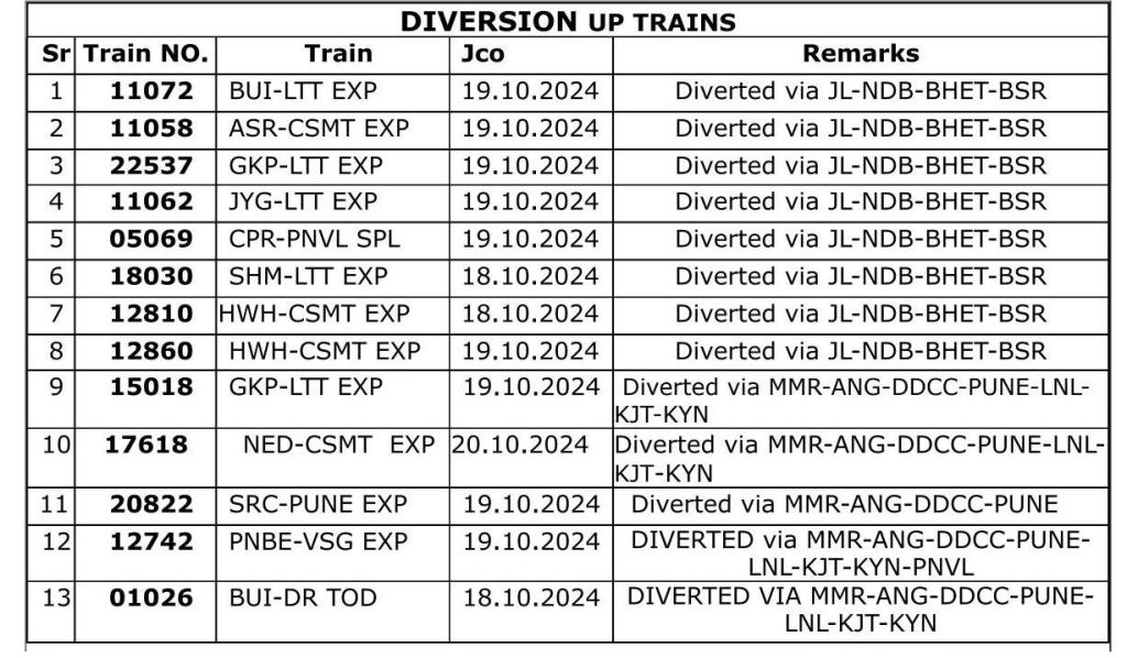 परावर्तित मार्ग : दिवा, वसई रोड, भेस्तान, नंदुरबार, जलगांव
