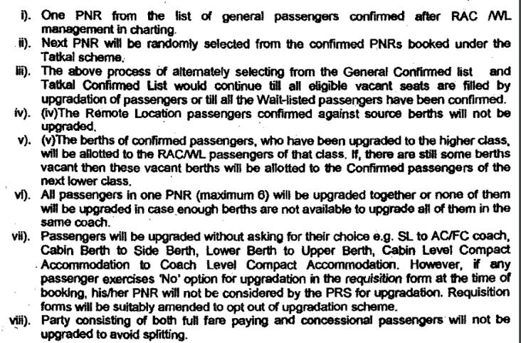 यात्रियों से उनकी पसंद पूछे बिना ही उन्हें अपग्रेड किया जाएगा, जैसे कि स्लिपर क्लास से वातानुकूलित कोच, केबिन बर्थ से साइड बर्थ, लोअर बर्थ से अपर बर्थ इस तरह। हालांकि, अगर कोई यात्री बुकिंग के समय अनुरोध फॉर्म में अपग्रेडेशन के लिए ‘नहीं’ विकल्प का पर्याय चुनता है, तो PRS यात्री आरक्षण प्रणाली द्वारा उसके PNR को अपग्रेडेशन के लिए योग्य नहीं माना जाएगा। आरक्षण फॉर्म में यह पर्याय उपलब्ध रहता है।