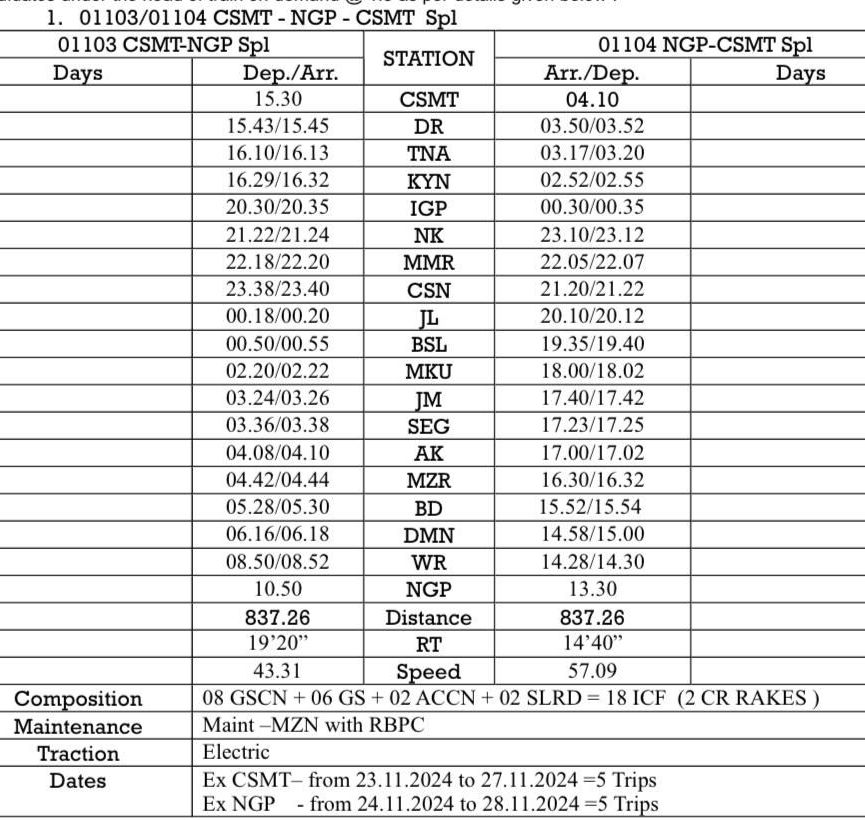 01103 आरआरबी विशेष 23.11.2024 से 27.11.2024 तक प्रतिदिन दोपहर 15.30 को मुम्बई छत्रपति शिवाजी महाराज टर्मिनस से प्रस्थान करेगी और अगले दिन सुबह 10.50 को नागपुर पहुंचेगी (कुल 5 फेरे)