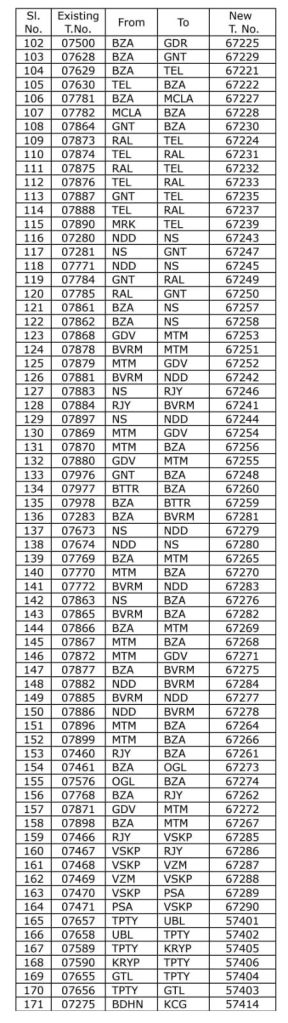 भारतीय रेल के सभी क्षेत्रीय रेल्वेज के सवारी गाड़ियोंकी रिनम्बरिंग हो रही है। हम प्रयत्न करेंगे बाकी क्षेत्रीय रेल्वेज के भी बदले सवारी गाड़ी क्रमांक पोस्ट में सम्मिलित करेंगे।