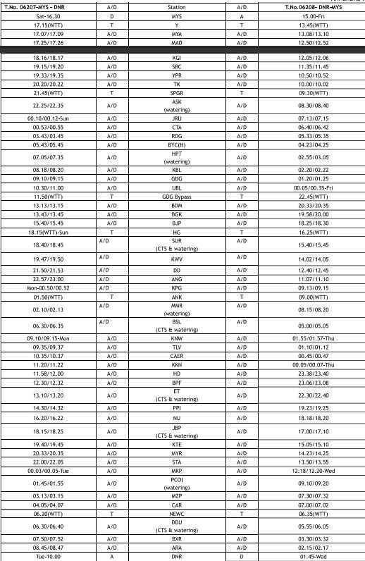 06207 मैसूरु दानापुर विशेष मैसूरु से दिनांक 18/01/2025, 15/02/2025, 01/03/2025 को शनिवार दोपहर 16:30 को रवाना होगी। यह गाड़ी मंगलवार को सुबह 10:00 बजे दानापुर पहुँचेंगी। [03 फेरे]