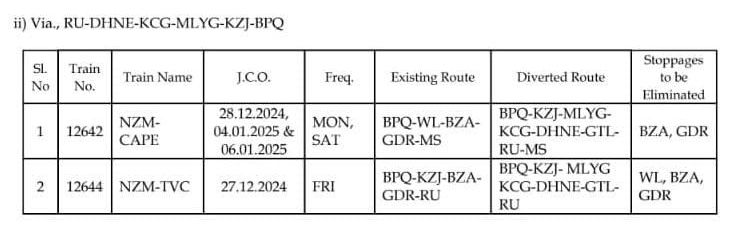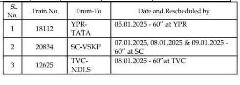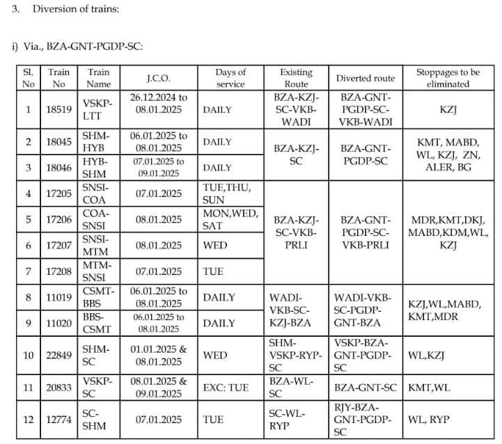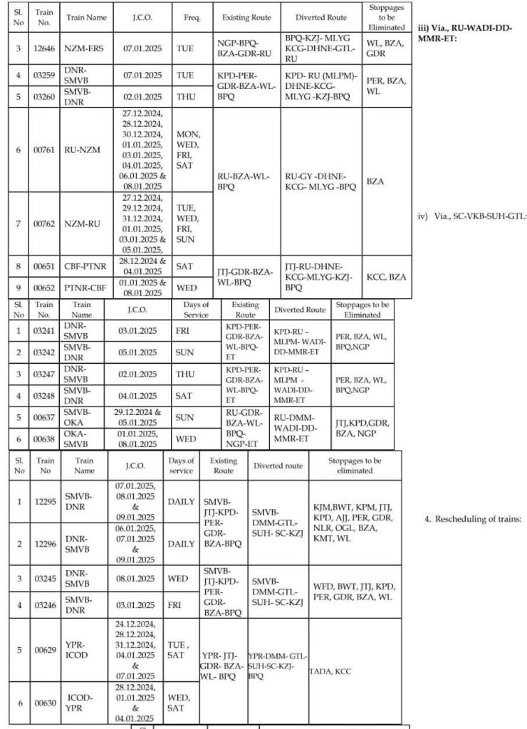 नियमित मार्ग बदलकर परावर्तित रेल मार्ग से चलनेवाली गाड़ियाँ : ( परावर्तित मार्ग : विजयवाड़ा, गुण्टूर, पागीडीपल्ली, सिकंदराबाद )