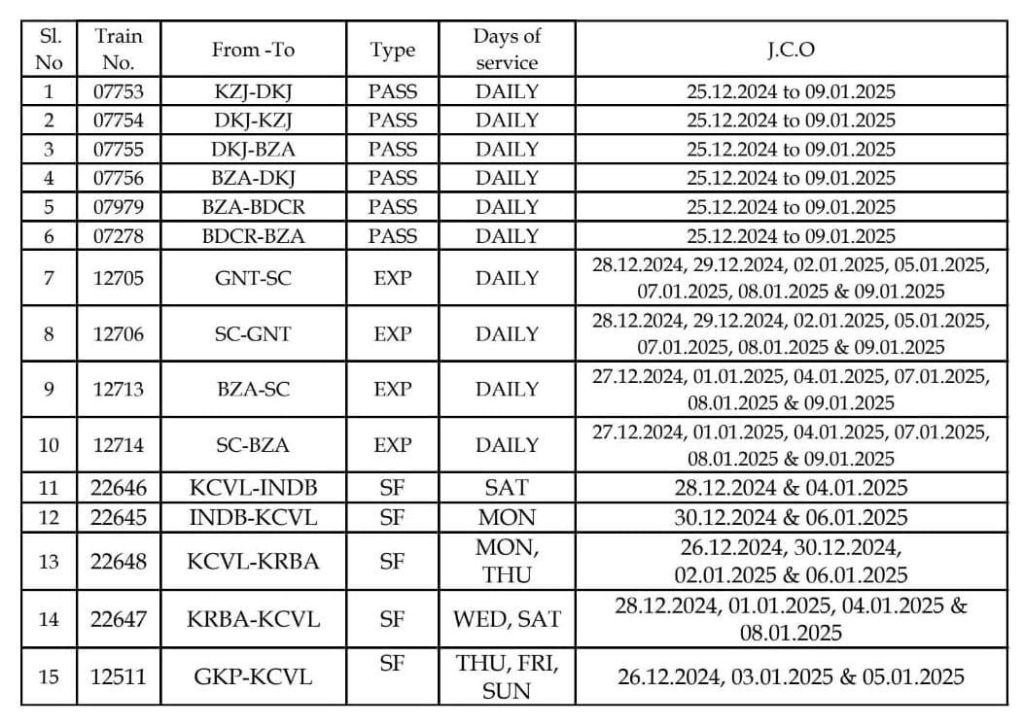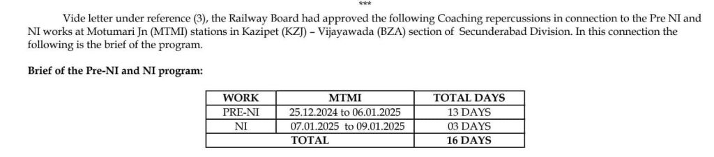 दमरे SCR के मोटूमारी स्टेशनपर दिनांक 25 दिसम्बर 2024 से 09 जनवरी 2025 कुल 14 दिनोंका रेल ब्लॉक मंजूर किया गया है। निम्नलिखित यात्री गाड़ियाँ बाधित रहेंगी।