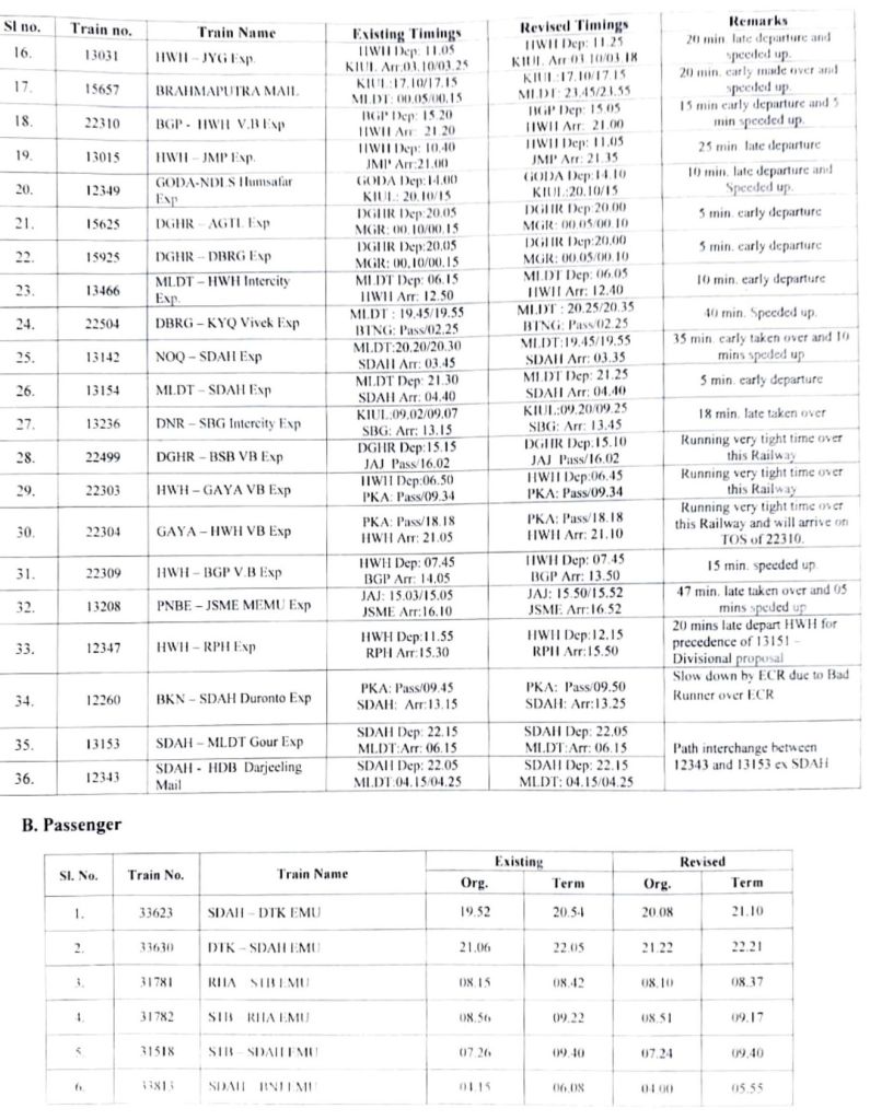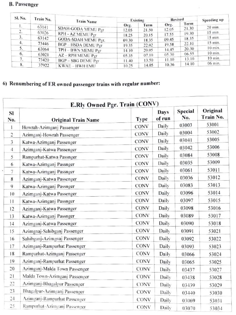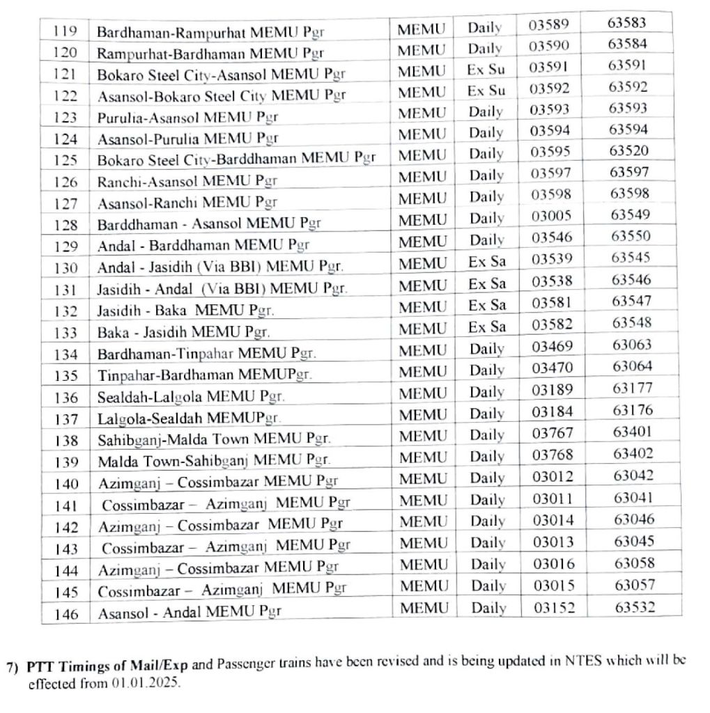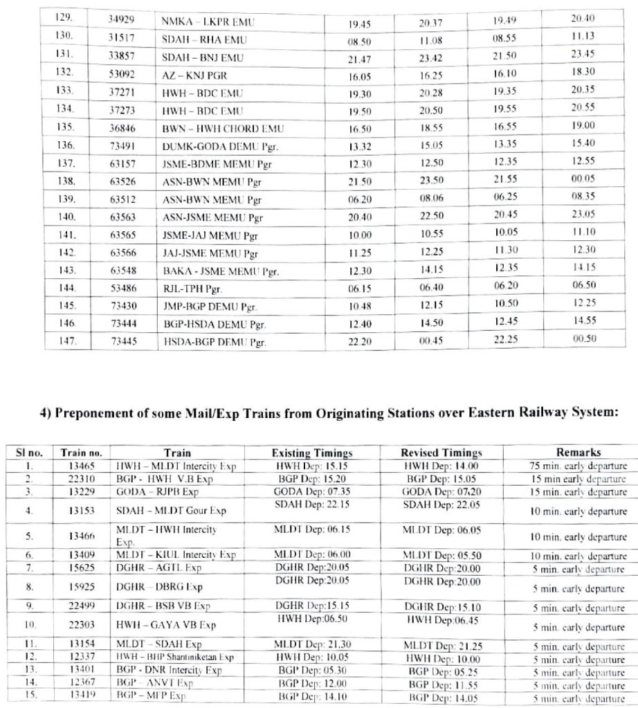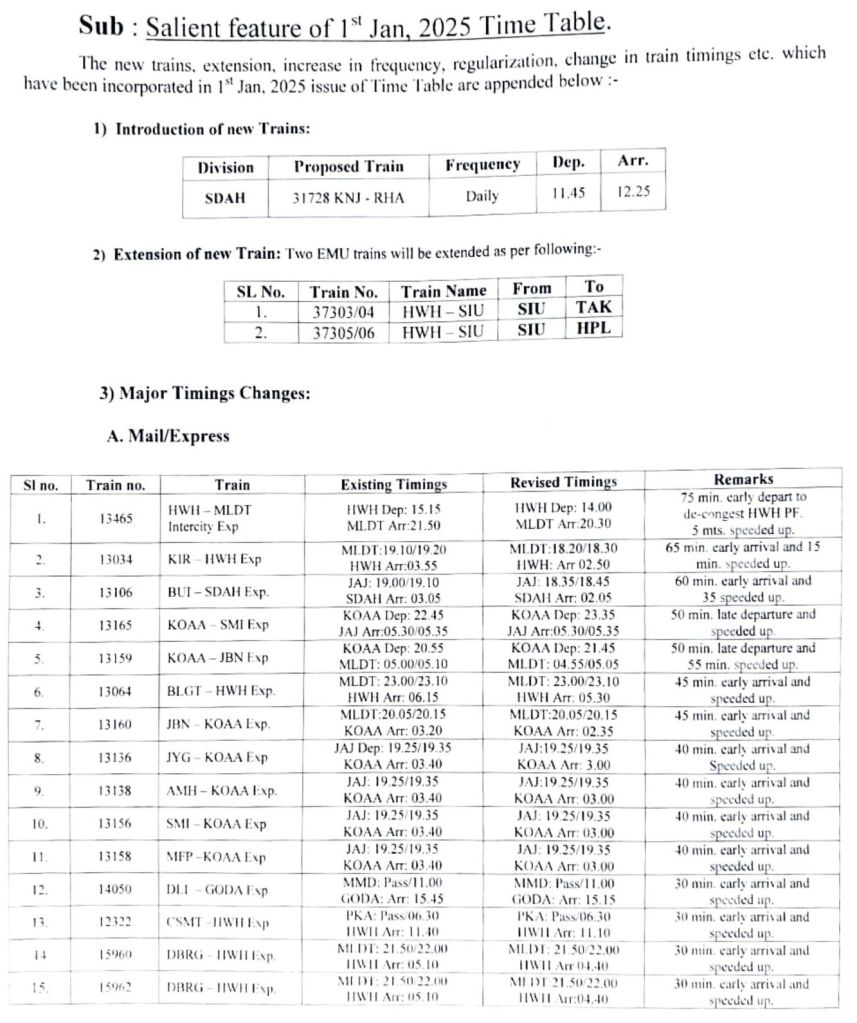 भारतीय रेल की समयसारणी 01 जनवरी 2025 से बदली जा रही है। सभी गाड़ियोंमे किए गए बदलाव NTES नैशनल ट्रेन इन्क्वायरी सिस्टम पर दिनांक 01 जनवरी 2025 पर उपलब्ध हो जाएंगे। इसमे पूर्व रेल ER द्वारा किए जाने वाले बदलावों के प्रमुख अंश..