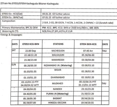 07053 विशेष काचेगुड़ा से दिनांक 04/1/2025 से प्रत्येक शनिवार को बीकानेर के लिए रात 22:00 को रवाना होगी। वापसी में 07054 विशेष बीकानेर से दिनांक 07/1/2025 से प्रत्येक मंगलवार को काचेगुड़ा के लिए दोपहर 13:30 को रवाना होगी।
