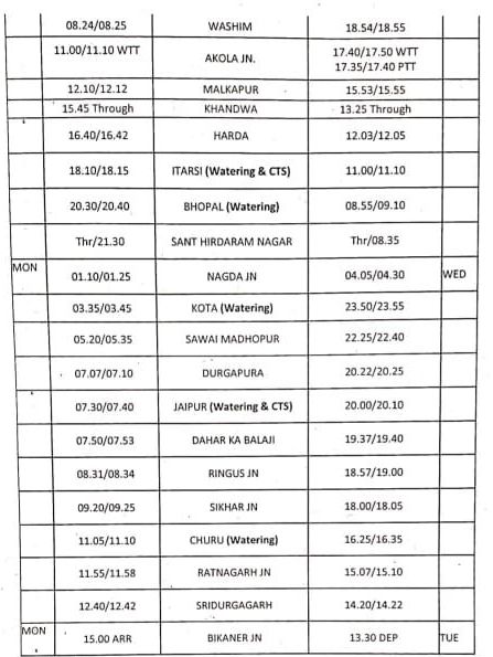 स्टोपेजेस : काचेगुड़ा, मलकानगिरी, कामारेड्डी, निजामाबाद, बसर, धर्माबाद, मुदखेड़, नांदेड़, पुर्णा, बसमत, हिंगोली, वाशिम, अकोला, मलकापुर, हरदा, इटारसी, भोपाल, सन्त हिरदाराम नगर, नागदा, कोटा, सवाई माधोपुर, दुर्गापुरा, जयपुर, ढहर का बालाजी, रींगस, सीकर, चुरू, रतनगढ़, श्री डूंगरगढ़, बीकानेर