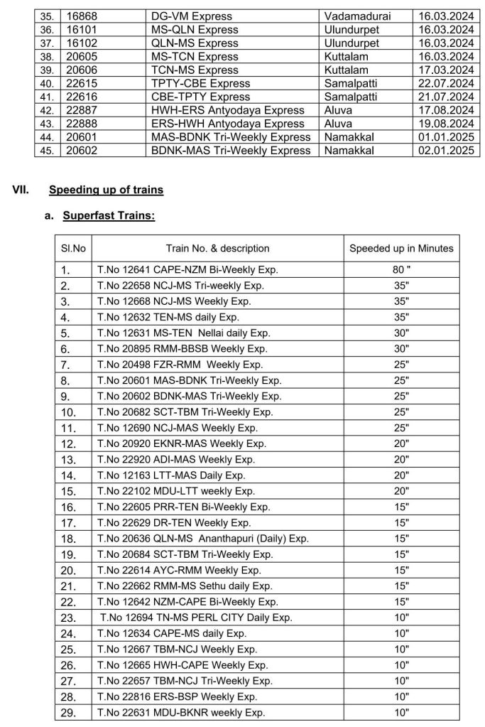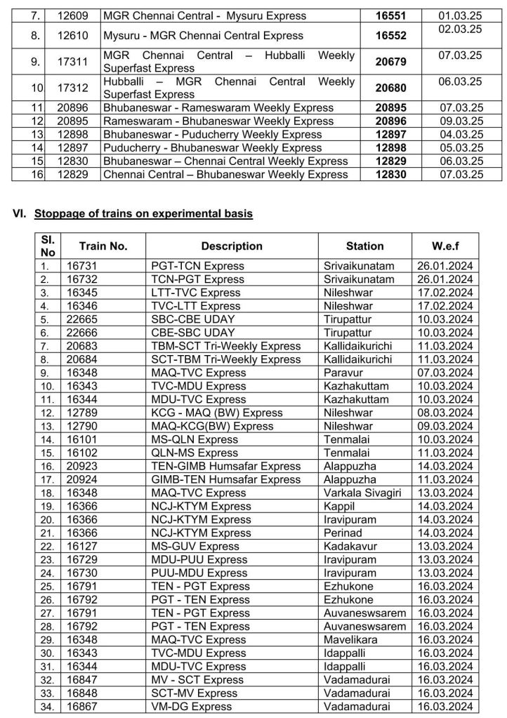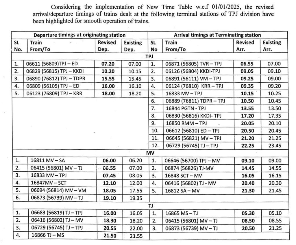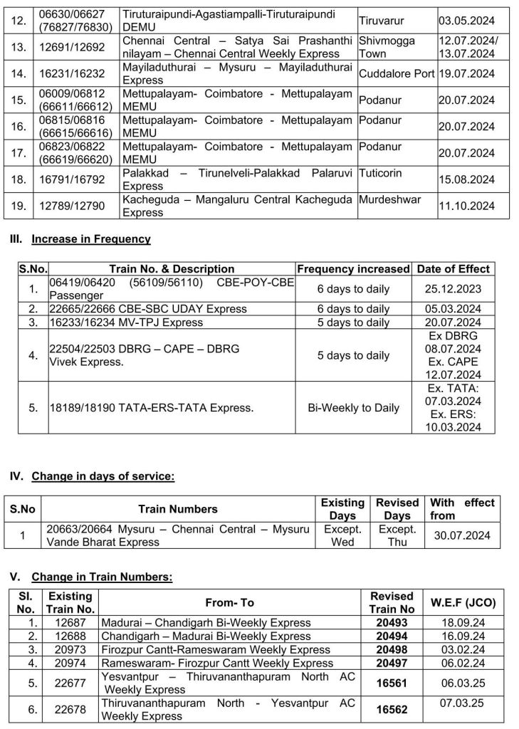 भारतीय रेल की समयसारणी 01 जनवरी 2025 से बदली जा रही है। सभी गाड़ियोंमे किए गए बदलाव NTES नैशनल ट्रेन इन्क्वायरी सिस्टम पर दिनांक 01 जनवरी 2025 पर उपलब्ध हो जाएंगे। इसमे दक्षिण रेल SR द्वारा किए जाने वाले बदलावों के प्रमुख अंश..