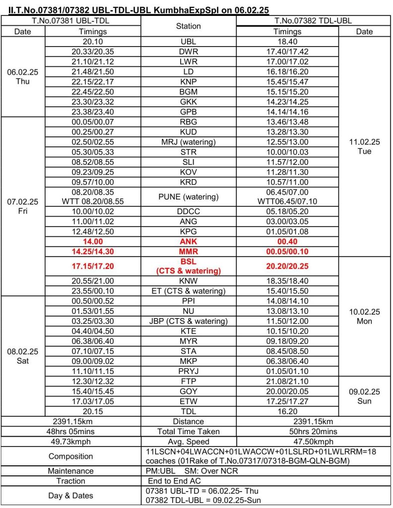 07381 विशेष हुब्बाली से गुरुवार दिनांक 06 फरवरी को रात 20:10 निकल कर प्रयागराज होते हुए शनिवार दिनांक 08 फरवरी की रात 20:15 को टूण्डला पहुँचेंगी।