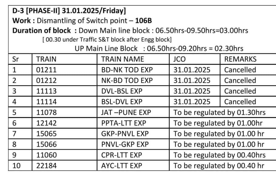 11078 जम्मूतवी पुणे झेलम एक्सप्रेस, जो भुसावल से दिनांक 31 जनवरी को रवाना होगी, 90 मिनिट नियंत्रित कर चलाई जाएगी।