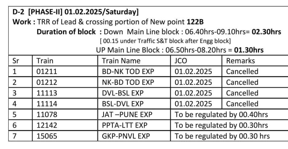 11078 जम्मूतवी पुणे झेलम एक्सप्रेस, जो भुसावल से दिनांक 01 फरवरी को रवाना होगी, 40 मिनिट नियंत्रित कर चलाई जाएगी।