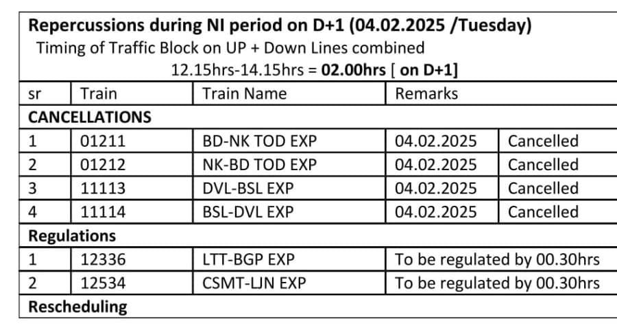 उपरोक्त ब्लॉक में बाधित होने वाली गाड़ियोंकी सूची तिथिनुसार दी गई है।