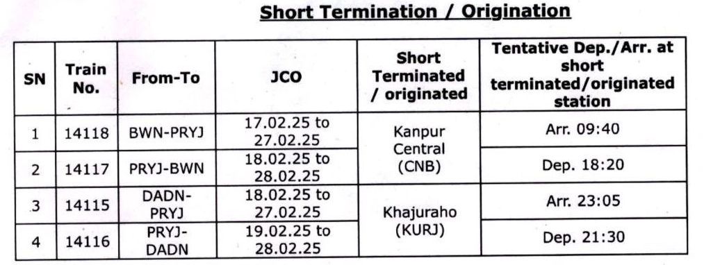 - गाड़ी संख्या 11071 लोकमान्य तिलक टर्मिनस – वाराणसी कामायनी एक्सप्रेस, यात्रा दिनांक – 18.02.2025 से 27.02.2025 तक। यह ट्रेन अपने निर्धारित मार्ग के बजाय बीना, वीरांगना लक्ष्मीबाई झांसी, कानपुर सेंट्रल, लखनऊ, जौनपुर होते हुए वाराणसी पहुंचेगी।