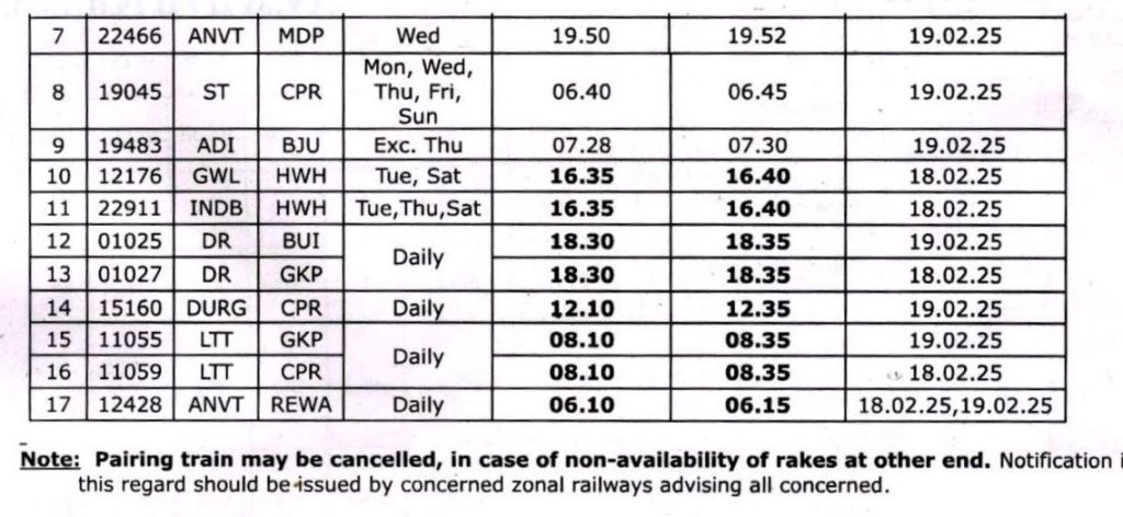 9) गाड़ी संख्या 11055 लोकमान्य तिलक टर्मिनस – गोरखपुर एक्सप्रेस दिनांक 18 फरवरी 2025 से 27 फरवरी 2025 तक अपने प्रारंभिक स्टेशन से निरस्त रहेगी।