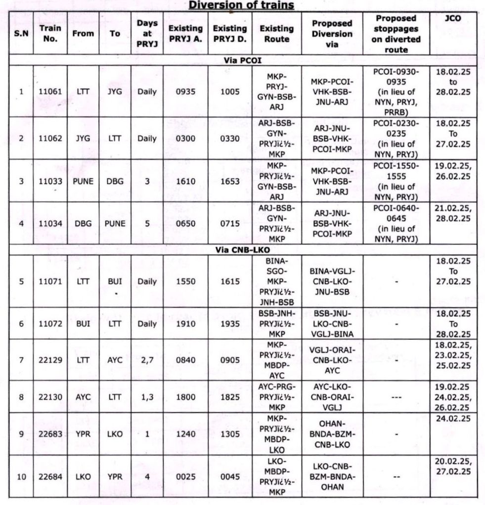 महाकुंभ मेला 2025 के दौरान भुसावल मंडल से गुजरने वाली कुछ ट्रेनों का मार्ग परिवर्तन