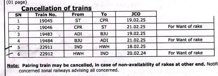 1) गाड़ी संख्या 19045 सूरत – छपरा ताप्ती गंगा एक्सप्रेस दिनांक 19 फरवरी 2025 से 27 फरवरी 2025 तक अपने प्रारंभिक स्टेशन से निरस्त रहेगी।