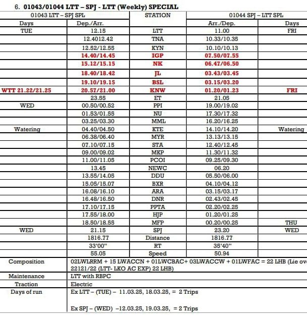 01043 साप्ताहिक विशेष, मंगलवार 11.03.2025 और 18.03.2025 को 12.15 बजे लोकमान्य तिलक टर्मिनस से रवाना होगी (2 फेरे) और अगले दिन 21.15 बजे समस्तीपुर पहुंचेगी।