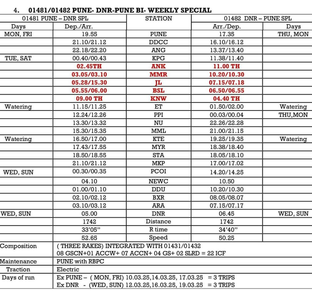 01482 दानापुर – पुणे द्वि-साप्ताहिक विशेष 12.03.2025, 16.03.2025 और 19.03.2025 को 06:45 बजे दानापुर से रवाना होगी और अगले दिन 17:35 बजे पुणे पहुंचेगी। (3 फेरे)।