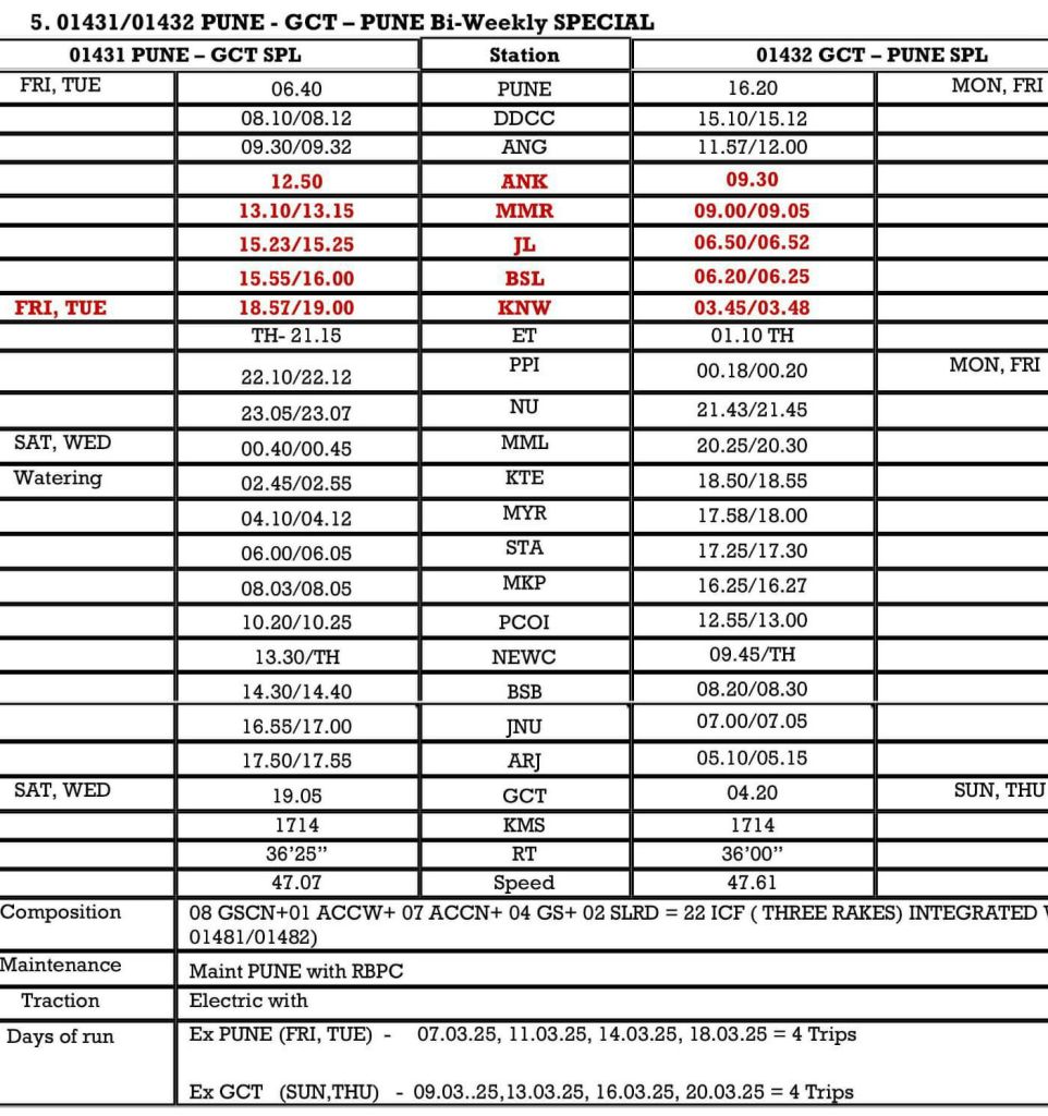 01432 ग़ाज़ीपुर सिटी – पुणे द्वि-साप्ताहिक विशेष 09.03.2025, 13.03.2025, 16.03.2025 और 20.03.2025 को 04:20 बजे ग़ाज़ीपुर सिटी से रवाना होगी और अगले दिन 16:20 बजे पुणे पहुंचेगी (4 यात्राएँ)।