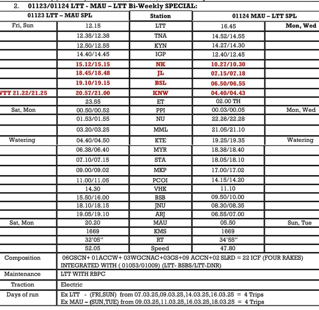 01124 द्वि-साप्ताहिक विशेष 09.03.2025, 11.03.2025, 16.03.2025, 18.03.2025 (4 फेरे) को 05.50 बजे मऊ से रवाना होगी और अगले दिन 16.45 बजे लोकमान्य तिलक टर्मिनस पहुंचेगी।