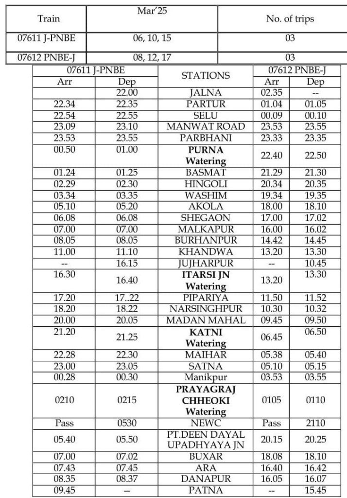 07611/12 जालना पटना जालना होली विशेष वाया पूर्णा, अकोला, खण्डवा, इटारसी, कटनी, प्रयागराज छिंवकी, पण्डित दीनदयाल उपाध्याय जंक्शन (3-3 फेरे)