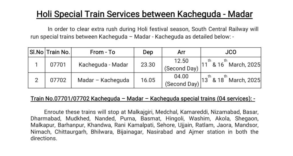 होली विशेष गाड़ियोंकी सूची लगातार आ रही है। द म रेल SCR ने निम्नलिखित दो मार्ग पर विशेष गाड़ियाँ चलाने की घोषणा की है।