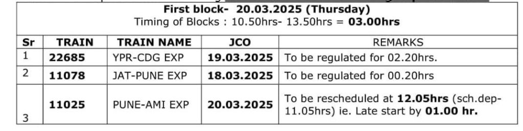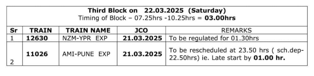 उपरोक्त रेल ब्लॉक्स के अलावा दिनांक 24 मार्च से 02 मई 2025 तक, 40 दिनोंके के लिए प्रत्येक दिन इसी खण्ड पर, 90 मिनट का ब्लॉक प्रदान किया गया है। हालाँकि इस दौरान किसी भी यात्री गाड़ी को बाधित नही किए जाने की सूचना है।