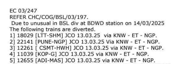 नवजीवन एक्सप्रेस, महाराष्ट्र एक्सप्रेस, हावड़ा एक्सप्रेस मार्ग पर जगह जगह पर रोक दी गई है। मार्ग की यात्री गाड़ियोंकी आवाजाही कब पुनर्स्थापित होंगी इस बारे में रेल विभाग से सूचना की प्रतीक्षा है।