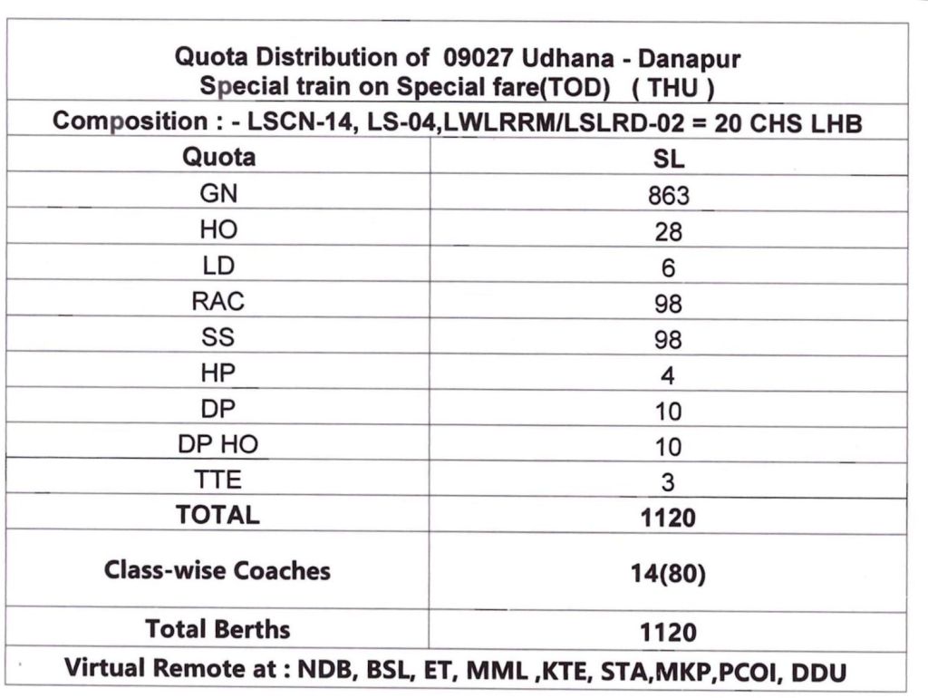 विशेष गाड़ियोंके कोटे का आवंटन निम्नप्रकार से किया जाता है,