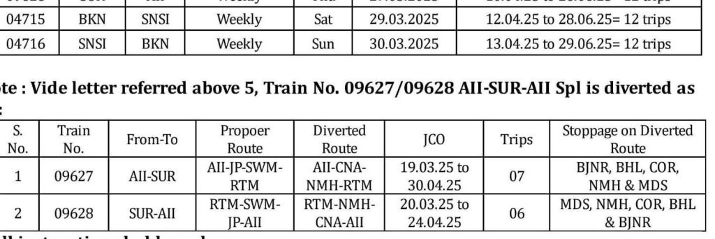 विशेष सूचना : 09627/28 अजमेर – सोलापुर – अजमेर के निम्नलिखित फेरे अजमेर से रतलाम के बीच जयपुर, सवाई माधोपुर की जगह परावर्तित मार्ग अजमेर, चित्तौड़ गढ़, नीमच, रतलाम होकर चलेंगे।