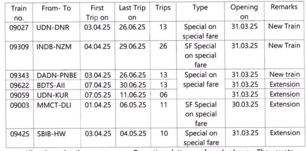 निम्नलिखित विशेष गाड़ियोंकी अवधि में भी कुछ फेरोंका विस्तार किया गया है,