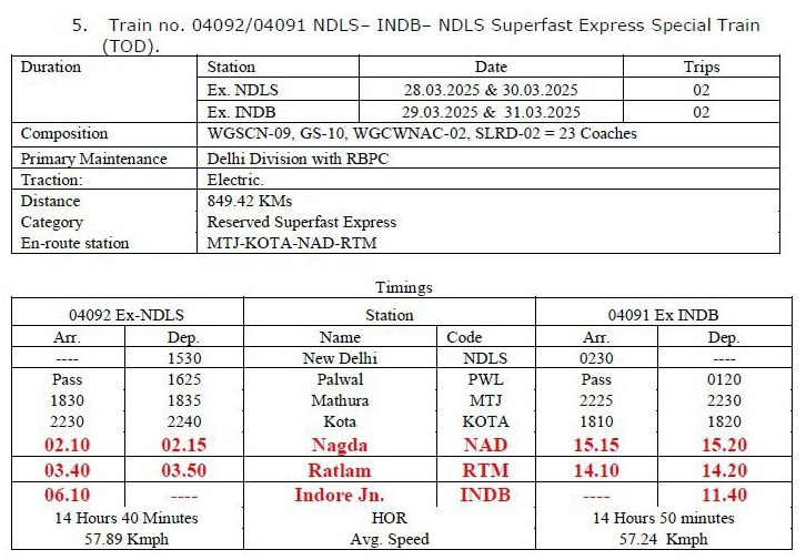 04092/91 इन्दौर नई दिल्ली इन्दौर सुपरफास्ट विशेष