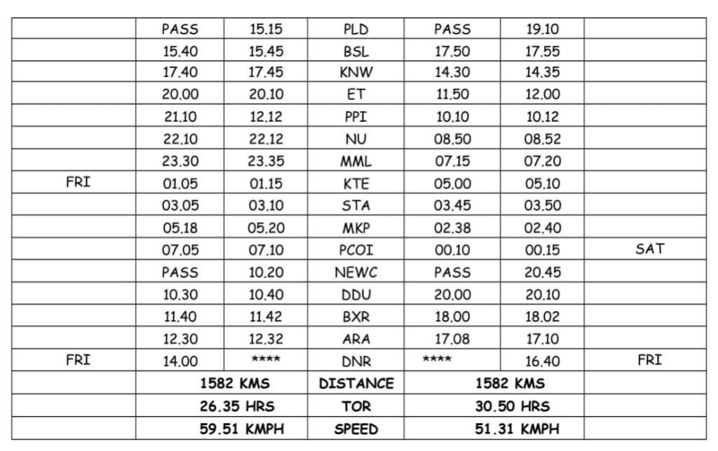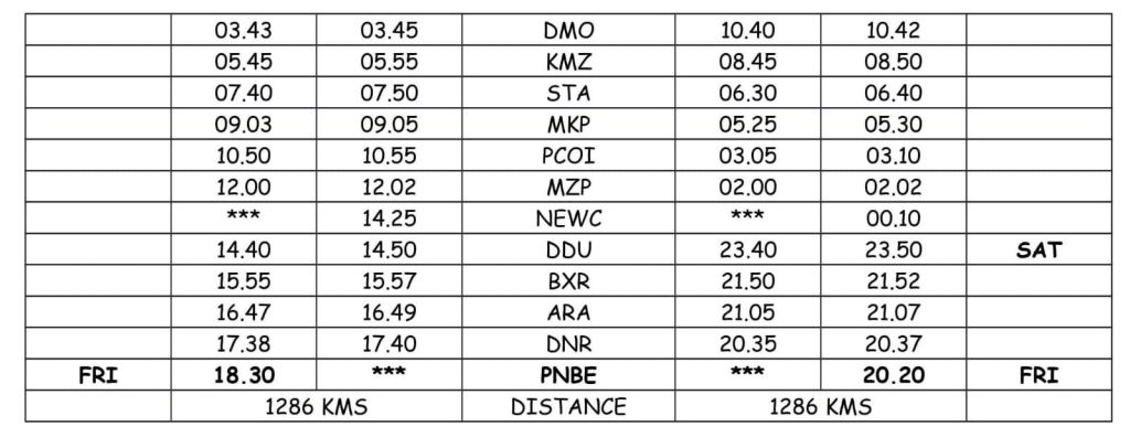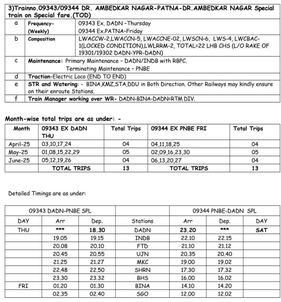 09343 विशेष प्रत्येक गुरुवार को दिनांक अप्रैल की 03, 10, 17, 24, मई की 01, 08, 15, 22, 29 एवं जून की 05, 12, 19 और 26 को डॉ आंबेडकर नगर से रवाना होगी। वापसी में 09344 विशेष प्रत्येक शुक्रवार को अप्रैल की 04, 11, 18, 25, मई की 02, 09, 16, 23, 30 एवं जून की 06, 13, 20 और 27 को पटना से रवाना होगी।