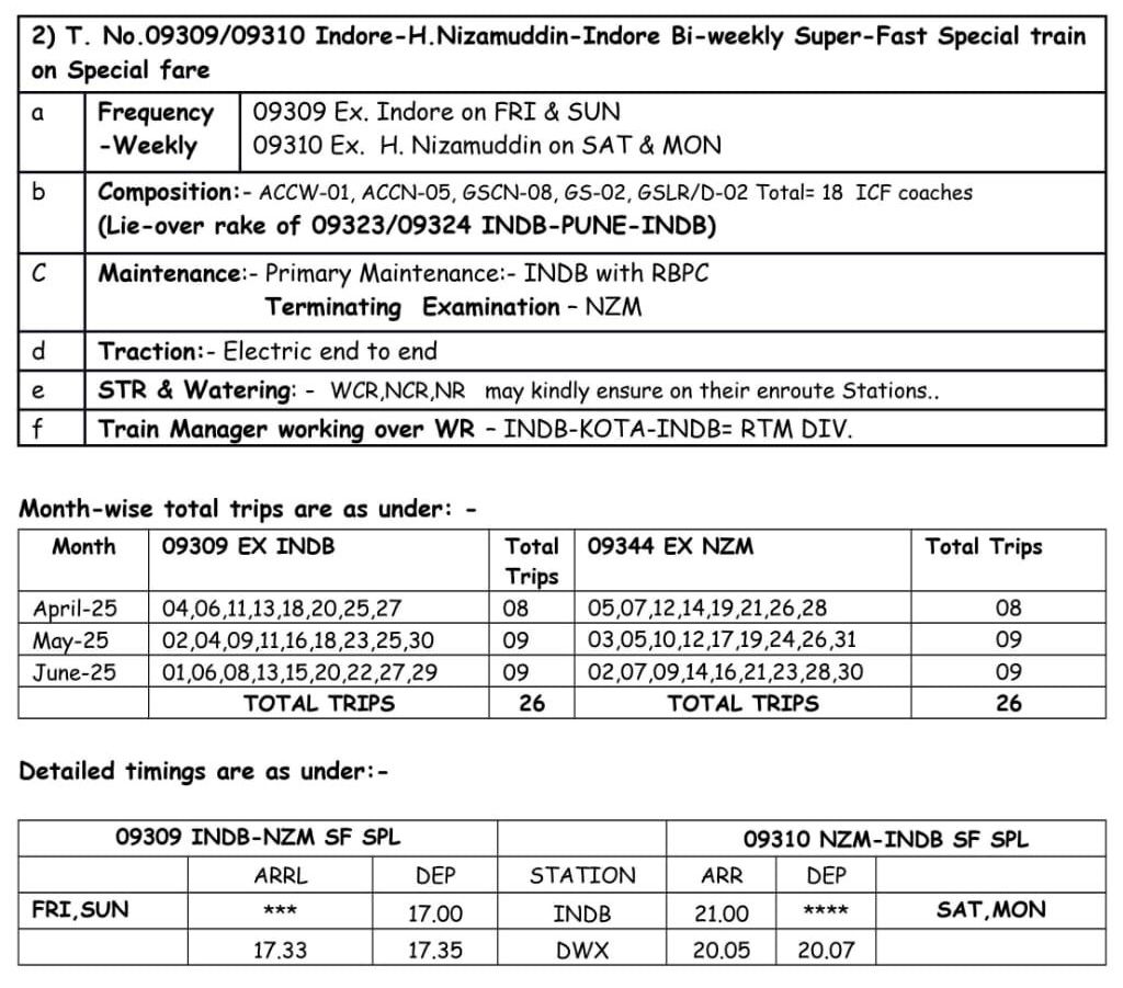 09309 विशेष प्रत्येक शुक्रवार एवं रविवार को दिनांक अप्रैल की 04, 06, 11, 13, 18, 20, 25, 27 मई की 02, 04, 09, 11, 16, 18, 25, 27 एवं जून की 01, 06, 08, 13, 15, 20, 22, 27 और 29 को इन्दौर से रवाना होगी। वापसी में 09310 प्रत्येक शनिवार एवं सोमवार को दिनांक अप्रैल की 05, 07, 12, 14, 19, 21, 26, 28 मई की 03, 05, 10, 12, 17, 19, 26, 28 एवं जून की 02, 07, 09, 14, 16, 21, 23, 28 और 30 को हज़रत निजामुद्दीन से रवाना होगी।
