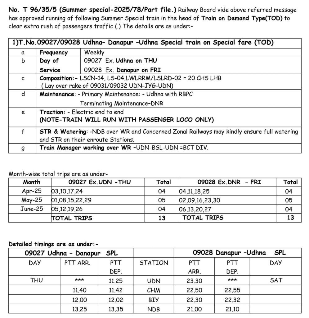 09027 विशेष प्रत्येक गुरुवार को दिनांक अप्रैल की 03, 10, 17, 24, मई की 01, 08, 15, 22, 29 एवं जून की 05, 12, 19 और 26 को उधना से रवाना होगी। वापसी में 09028 विशेष प्रत्येक शुक्रवार को अप्रैल की 04, 11, 18, 25, मई की 02, 09, 16, 23, 30 एवं जून की 06, 13, 20 और 27 को दानापुर से रवाना होगी।