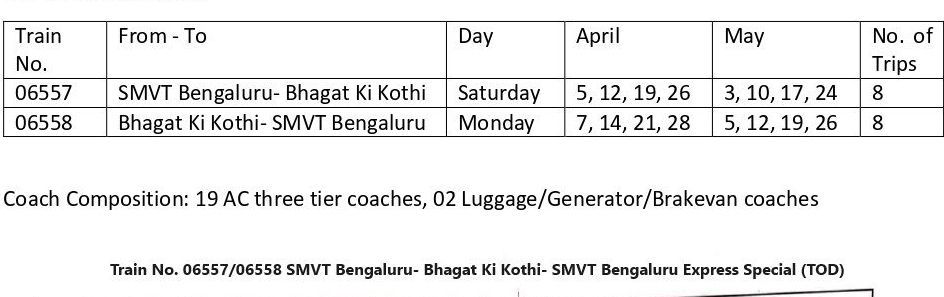 06557/58 सर मोक्षगुंडम विश्वेश्वरैया टर्मिनस बेंगलुरु – भगत की कोठी (जोधपुर) सर मोक्षगुंडम विश्वेश्वरैया टर्मिनस बेंगलुरु वातानुकूलित साप्ताहिक विशेष (8-8 फेरे) वाया अरसीकेरे, हुब्बाली, लौंडा, मिरज, पुणे, कल्याण, वसई रोड, सूरत, साबरमती, भीलड़ी, जालौर, समदड़ी, लूणी
