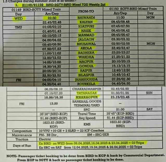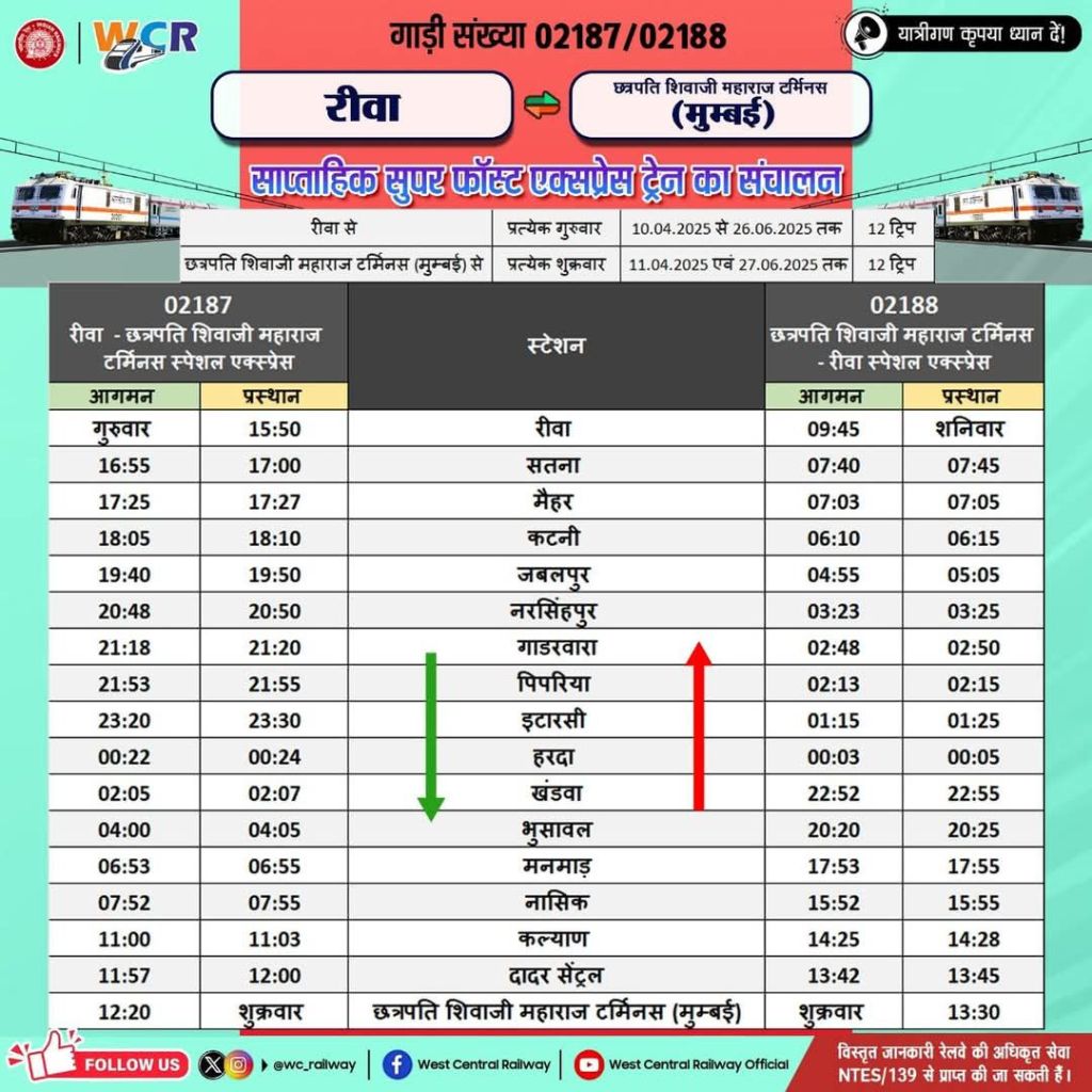 गाड़ी संख्या 01440 विशेष ट्रेन दिनांक 13.04.2025 से 25.05.2025 तक प्रत्येक रविवार को नागपुर से 16:15 बजे प्रस्थान करेगी और सोमवार को 07:20 बजे पुणे पहुंचेगी।
