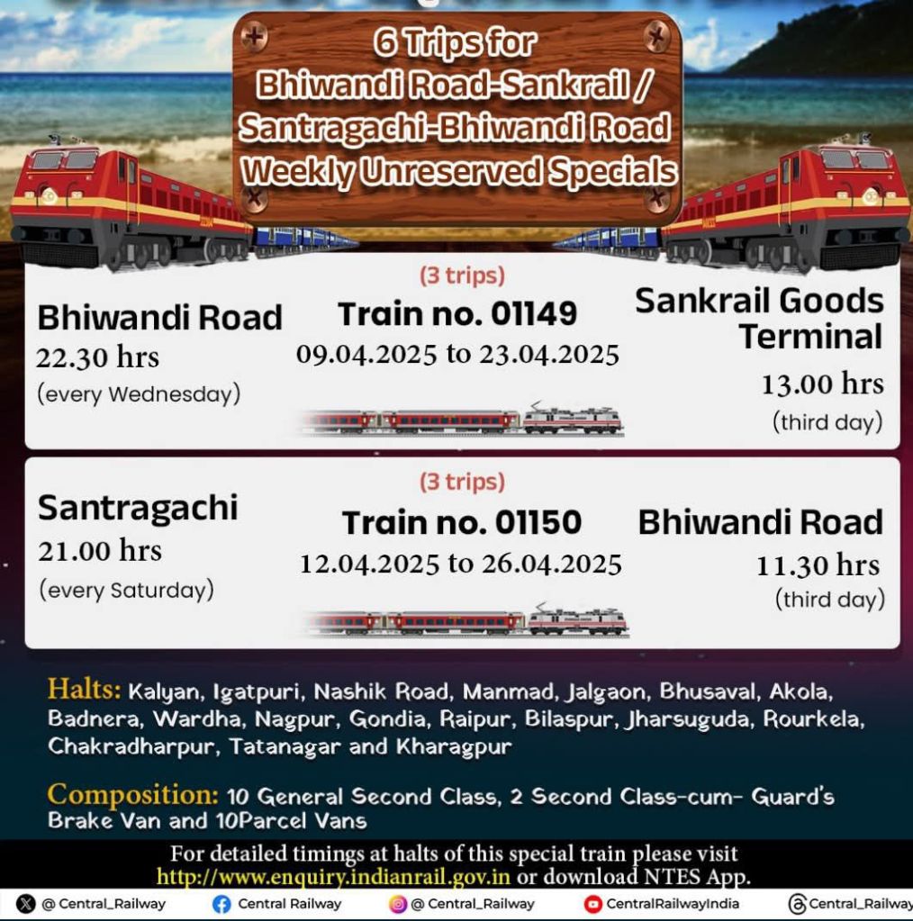 भिवण्डी रोड से सांकरेल गुड्स टर्मिनल/सान्तरागाछी भिवण्डी रोड साप्ताहिक अनारक्षित विशेष वाया भुसावल, नागपुर, बिलासपुर