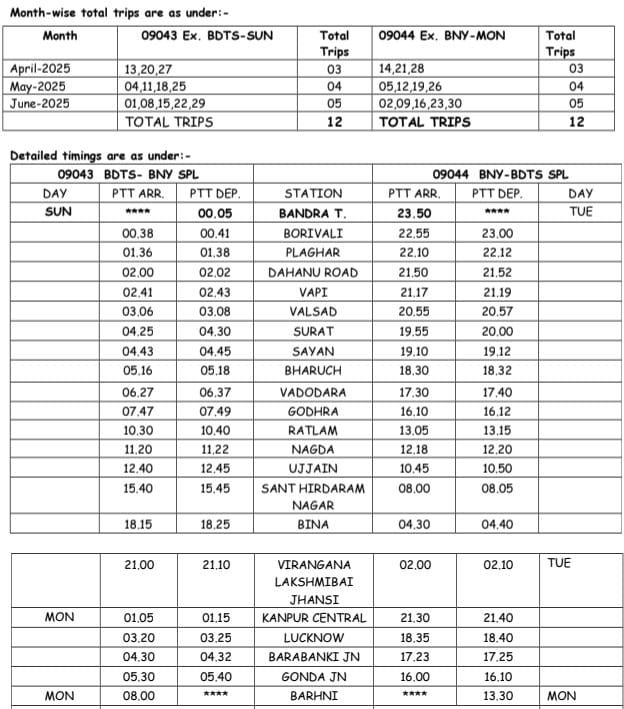 09043/44 बान्द्रा टर्मिनस – बढनी – बान्द्रा टर्मिनस (12-12 फेरे)वाया वडोदरा, रतलाम, उज्जैन, संत हिरदाराम नगर, बीना, झांसी, कानपुर, लखनऊ, गोण्डा
