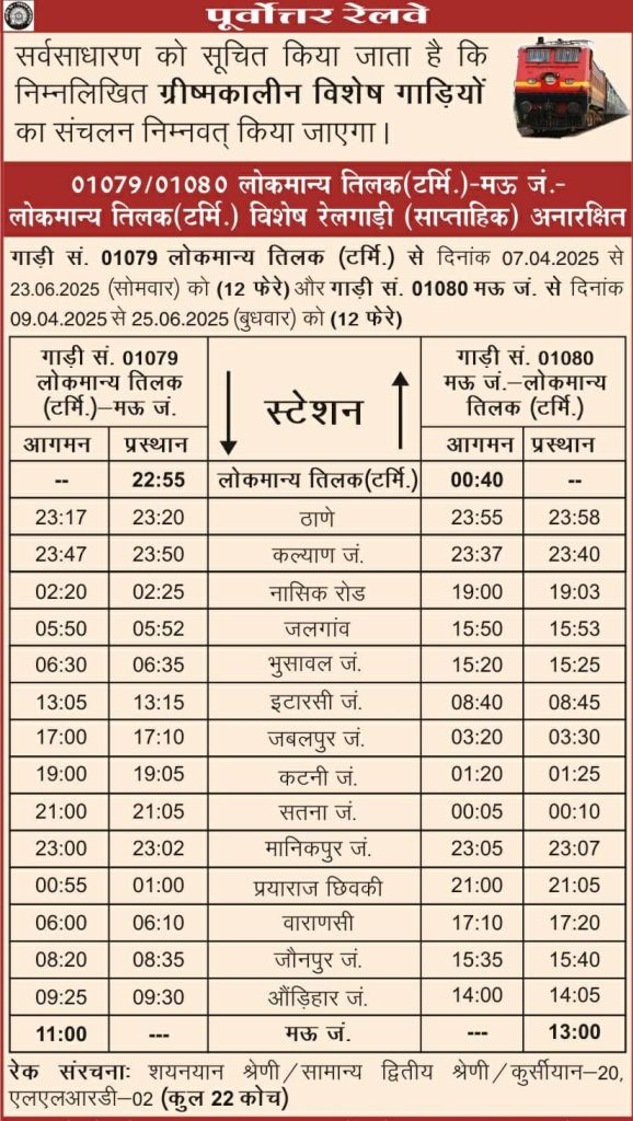 01079/80 लोकमान्य तिलक टर्मिनस – मऊ – लोकमान्य तिलक टर्मिनस साप्ताहिक विशेष (12-12 फेरे)