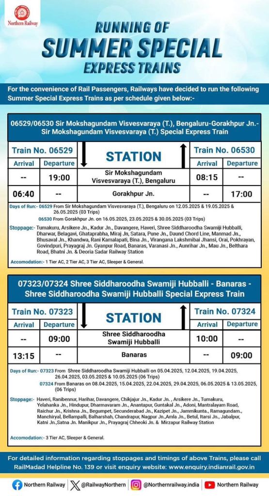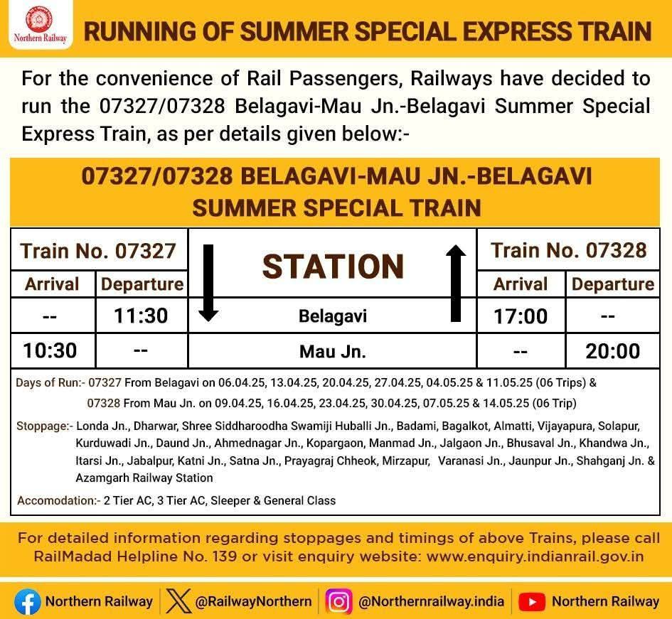 गाड़ी संख्या 07327 विशेष ट्रेन दिनांक 06.04.2025 से 11.05.2025 तक प्रत्येक रविवार को बेलगाम से 11:30 बजे प्रस्थान करेगी और मंगलवार को 10:30 बजे मऊ पहुंचेगी।